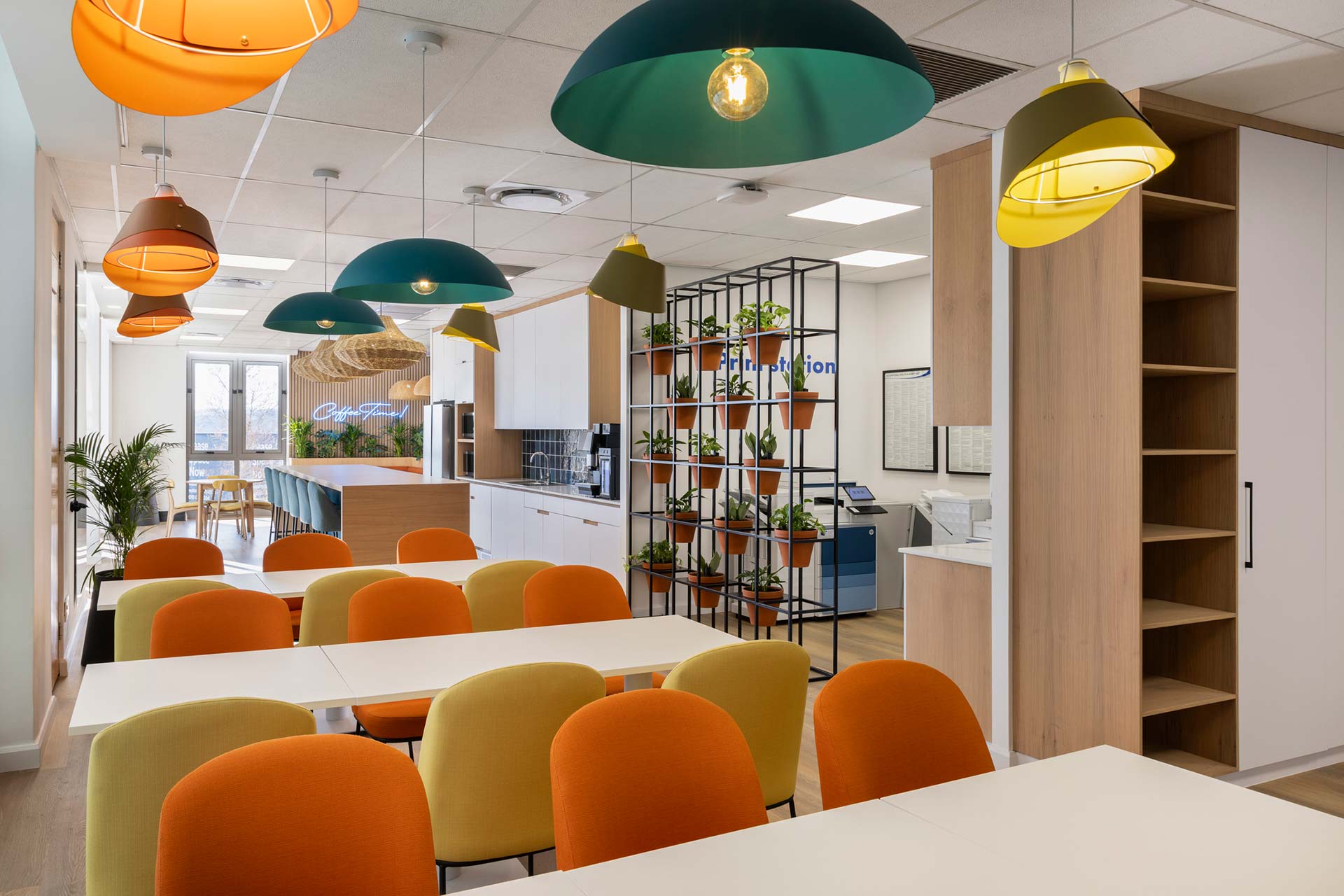 Office canteen with cushioned banquette seating in Sandoz workspace in Johannesburg
